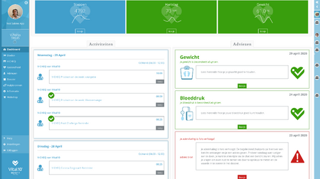Via het Dashboard kan de deelnemer in één overzicht zien hoe zijn/haar gezondheid ervoor staat. Dit wordt aantrekkelijk en toegankelijk visueel vormgegeven, waarbij de deelnemer ook gerichte adviezen voor verbetering krijgt indien nodig. Tijdens het programma kunnen vitaliteit punten worden gespaard en de score hiervan wordt hier weergegeven d.m.v. een (gezondheids) meter stand. Ook worden alle afspraken met de verpleegkundige, fysiotherapeut, cardioloog of andere disciplines overzichtelijk weergegeven evenals activiteiten die u te doen staan tijdens het revalidatietraject.