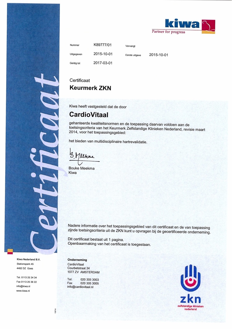 Het allerbelangrijkste is natuurlijk de kwaliteit van een behandeling. Het ZKN-keurmerk kwam als beste keurmerk in de zorg uit de bus volgens de consumentenbond. Klinieken met een ZKN keurmerk voldoen aan de strengste kwaliteitsnormen en staan garant voor een optimale behandeling. Wij voldoen aan dit keurmerk. Bekijk deze hier: Keurmerk ZKN CardioVitaal.
